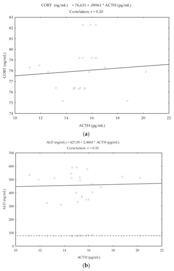 Pearson’s correlation coefficients (r) showed a significant and positive relationship between ACTH and CORT (r = 0.20; p < 0.05), and ACTH and ALD (r = 0.32; p < 0.05) (Figure 2).