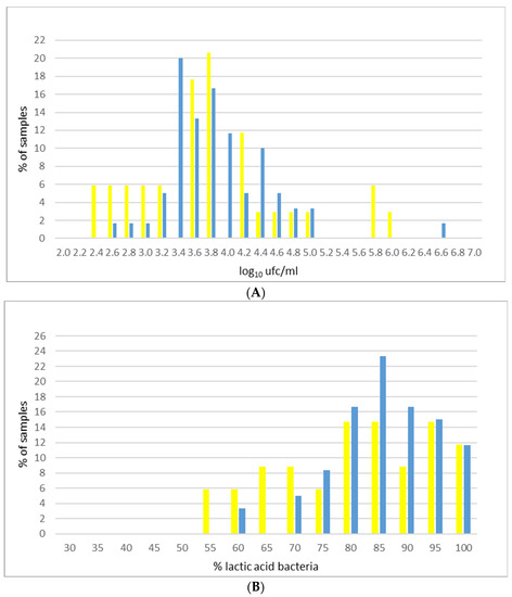 Distribution of LAB (A) and percentage of LAB on SPC (B) in bulk tank milk samples (blue bars = winter; yellow bars = summer).