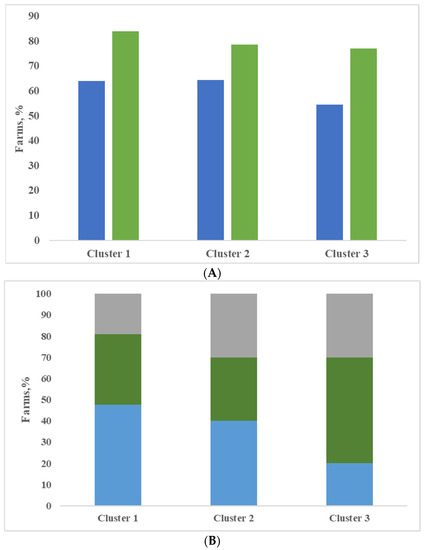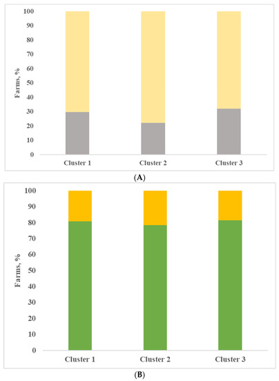 Finally, all the farms included in the evaluation were classified, with the support of cluster analysis based on variables described in the previous section. Three clusters were obtained and in Table 4, the analysis of variance is shown for the most interesting variables. The clusters identified did not differ widely from each other; as already mentioned, all farms kept the herd in permanent confinement without pasture, all farms were located in the same area and were milk production specialist farms. Most of the farms produced milk for Grana Padano PDO cheese (81.4%, 85.7% and 85.2% for clusters 1, 2 and 3). In the first cluster, there are the largest farms, represented as number of lactating cows, and the most productive ones, represented as daily milk production, although not significant. The dairy cows’ ration included a higher quantity of maize silage and lower percentage of forages compared to the other two groups of farms, although not significant. Most of the farms applied a complete milking routine with pre-dipping (16 yes vs. 9 no) and post-dipping (79%) (Figure 2A). The udder cleanliness was very good, with the lowest percentage of dirty udders (Figure 2B). In the farms belonging to cluster 1, animals were bred in cubicles (81%), and most farms used straw as bedding (26 farms), as shown in Figure 3. Compared with the other two clusters, milk produced by farms of cluster 1 was characterized by the lowest and significantly different values of SPC in milk, and this result is consistent with Zucali et al. [18], who showed a positive effect of application of two or more milking operations (fore-stripping, pre-dipping, post-dipping) on SPC milk content, and with the conclusion of Mallet et al. [1], who showed that the pre-dipping was associated with lower levels of SPC. Also, the other microbial groups considered, LAB included, registered the lowest values in comparison to the other clusters; indeed, the differences were not significant, and this is consistent with the conclusion of Verdier-Metz et al. [10].