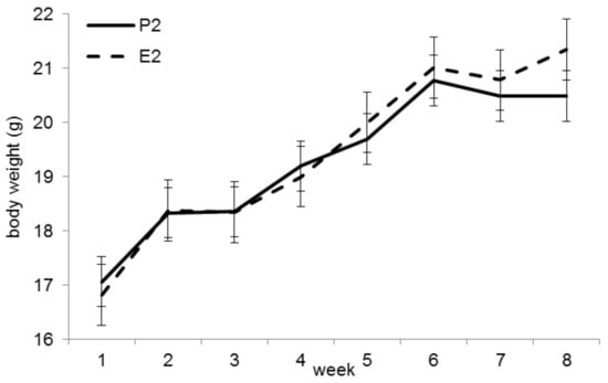 The initial BW did not differ between groups P2 and E2 (p = 0.53). At the end of the trial, animals in group E2 were significantly heavier (mean 21.3 ± 1.0 g vs. 20.5 ± 1.1 g, p < 0.05, Figure 2). Feed intakes were significantly higher in group E2 (4.31 ± 0.21 g/mouse/ day) than in group P2 (3.62 ± 0.33 g/mouse/day; p < 0.001).