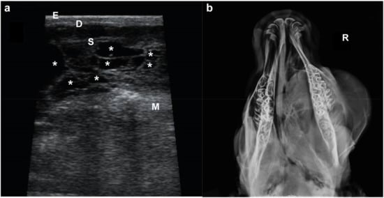 Imaging of the suborbital mass. (a) US image showing the three superficial layers (E, epidermis; D, dermis; S, subcutaneous tissue) overlying the malaris muscle (M) (note the bright hyperechoic appearance) and the mass with an irregular shape and multicavitary (*) (note the septated cavities filled with an anechogenic content) delimitated by S and M. (b) Radiography of the head in a dorso-ventral view (note that the mass extends to the left side of the hard palate). R, right side.