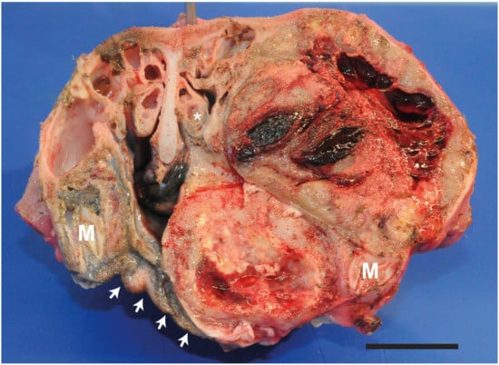 Macroscopical aspect of the suborbital congenital undifferentiated sarcoma upon transversal section at the level of the last molars (rostral aspect). Note that the neoplasm disrupts the morphology of the nasal cavities and of the palate profile (arrows) by squeezing all right nasal meatus and infiltrating the ventral conca (*). Ventrally the neoplasm displaces the palate and slightly the nasal septum to the left. The neoplasm appears multilobular, poorly demarcated, cavitated with multiple haemorrhagic and necrotic areas. M, last molar. Bar 4 cm.