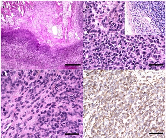 Histological and immunohistochemical features of undifferentiated sarcoma. (a) Solid lobules of neoplastic cells invading the bone trabeculae which have scalloped edges, HE, 40×, bar 500 micron. (b) Round to polygonal neoplastic cells with intermediate N/C ratio, marked anisocytosis and anisokaryosis, and numerous mitotic figures, HE, 400×, bar 100 micron; Inset: lymph node metastasis: neoplastic cells invading the subcapsular sinus. (c) Spindle to round neoplastic cells suggestive of highly heterogenous morphology of the neoplasm, HE, 400×, bar 100 micron (d) Positive immunoexpression of vimentin in the cytoplasm of neoplastic cells, 400×, bar 100 micron.