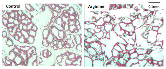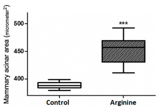 Figure 1 depicts a mammary histological section of postnatal rats. The mammary acinus of the arginine group was more regular and consistent as well as relatively larger in sectional area while the control group was not uniform in size and relatively small in sectional area with partial incomplete development. By measuring and calculating the sectional acinar area of the two groups, we observed that sectional acinus area with dietary arginine was significantly larger than the control (p < 0.001) (Figure 2).