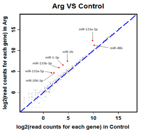 The miRNAs are a class of non-coding small RNA involved in post-transcriptional gene silencing to regulate transcription primarily via degradation of the complementary mRNA target and/or translational suppression. The development of mammary tissue is accompanied by morphological and transcriptional changes through the stages of lactation associated with differentially expressed miRNA. Thus, miRNA sequencing offers the opportunity to reveal the gene expression of an individual in a particular developmental period and in a given tissue. In other words, a miRNA will be assumed to play a regulatory role in a particular tissue or cell, or at the specific developmental stage if differential expression of the miRNA is associated with that condition. In this study, we observed seven miRNAs up-regulated via differential expression analysis and verified by qPCR including miR-206-3p, miR-133a-5p, miR-133b-3p, miR-1-3p, miR-133a-3p, miR-1b and miR-486, suggesting these miRNAs probably play roles in the well-developed acini cells when rats were fed arginine.