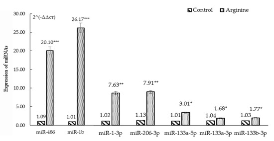 As shown in Table 2, 50 differentially expressed miRNAs (p < 0.001, FDR < 0.01) were obtained by primary screening at FDR < 0.01 (p < 0.001) in which 22 were down-regulated and 28 were up-regulated. Furthermore, seven miRNA (miR-206-3p, miR-133a-5p, miR-133b-3p, miR-1-3p, miR-133a-3p, miR-1b and miR-486) were screened by the secondary sequencing of FC > 2 or FC < 0.5 which were all up-regulated by arginine (Figure 3). Further verification by qPCR showed accordance with the differential expression of the sequencing (Figure 4).