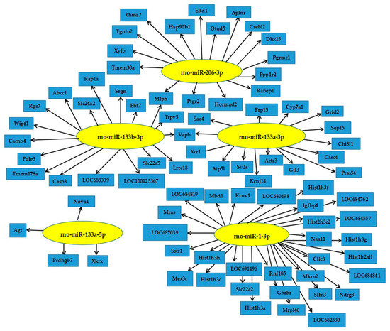 Single tissue-specific miRNAs have been identified in specific mammalian organs such as heart, liver or brain [33]. Interestingly, all of the miRNAs up-regulated we observed in this study have been reported as highly-expressed in muscle and belong to mammalian skeletal and cardiac muscle miRNA, involved in proliferation and differentiation during muscle formation. MiR-1, miR-133 and miR-206, for instance, are collectively known as the “myomiRs” for their prevalence in skeletal and cardiac muscle [34,35,36]. MiR-1 and miR-133, which are clustered on the same chromosomal loci, are transcribed together in a tissue-specific manner during development [37]. Although miR-1 and -206 are closely related in terms of expression and function, they differ based on chromosomal loci, specific targets and individual transcriptional activation [36]. The function of these three miRNA families on muscle development could be generalized as both miR-1 and miR-206 promoting myoblast-to-myotube differentiation. In contrast, miR-133 promotes proliferation of myoblasts, and inhibits their differentiation.