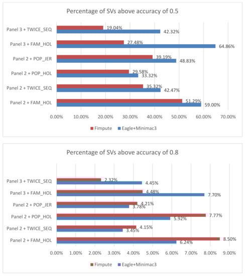 Percentage of deletions with imputation accuracy above thresholds 0.5 (top panel) and 0.8 (bottom panel) for Eagle + Minimac3 and FImpute. Y axis: imputation scenarios labelled by reference panel and structural variant (SV) sets.