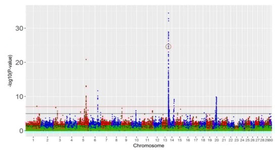 A list of genes within ±500 kb distance of the four significant SVs (Table S5) was compiled. Several genes have been previously identified for milk production traits. MGST1 on BTA5 has pleiotropic effects on bovine milk composition []. A cluster of genes on BTA6 around CSN2 (β-casein) directly regulates milk protein synthesis [,]. The histatherin (HSTN) gene was found 5 kb downstream to the SV found on BTA6, which was involved in a genomic rearrangement within the casein gene cluster. As this genomic rearrangement moved HSTN to a regulatory element that is important for CSN2 expression, HSTN is likely to be regulated like the casein genes during the lactation cycle []. C14H8orf33 [], ZNF34 and RPL8 [,], which were identified to be associated with milk production traits, are the top three genes that are close to the SV on BTA14. The four SVs found in our study may have potential effects on these genes. The DGAT1 gene located on BTA14:1,795,425–1,804,838 was suggested to be a candidate gene for milk production traits in cattle []. The deletion on BTA14: 1,299,687–1,299,831 found in our study was located 500 kb upstream of DGAT1. To investigate whether this deletion was affected by DGAT1, another GWAS model with the fixed effect of this gene added was applied to eliminate the effect of this gene, where the gene was represented as the genotype of the most significant BTA14 SNPs in each individual production trait (BTA14: 1736599). The significant deletion on BTA14 dropped below the significance threshold, suggesting this deletion was likely also tagging DGAT1.
