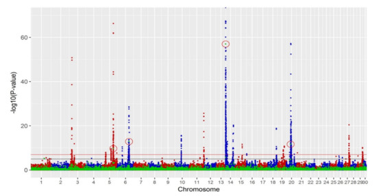 Manhattan plots of production multi-trait meta-analysis with −log10(p-value) on the vertical axis and chromosome number on the horizontal axis. The red line is the threshold of p-value 10−7, and the black line is the threshold of p-value 10−5. Blue and red dots represent SNP markers, and green dots represent SV markers. Significant SVs with p-value < 10−7 are circled in red. SNPs with p-value less than 10−70 were not plotted.