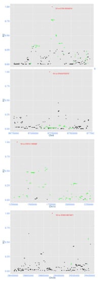 Linkage disequilibrium (LD) of four significant deletions with their surrounding SNPs. In each figure, the red spot is the deletion, black spots are surrounding SNPs and green spots are SNPs that are significant for multi-trait meta-analysis of production traits with p-value < 10−7.