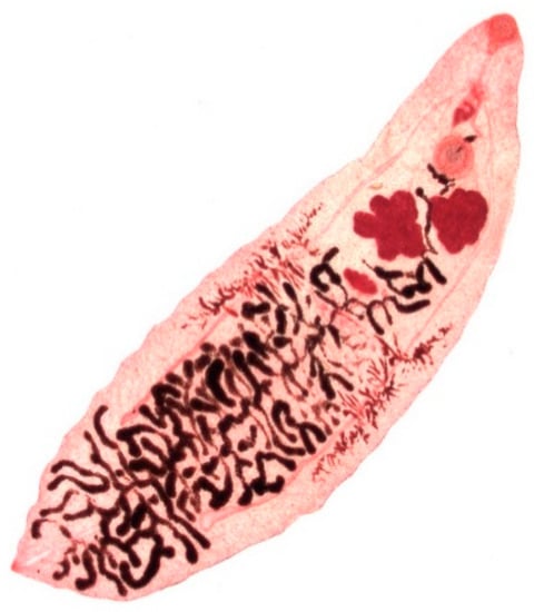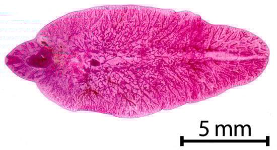 Members of the family Fasciolidae, also known as the common liver flukes, are trematodes that parasitize in the liver of particular herbivore mammals, especially in ruminants. Infections of other species as definitive hosts (e.g., equines, pigs, hares, dogs and rats) [5] are also possible but occur rarely. The highest pathogenic impact is in sheep, where fasciolosis may cause high morbidity and mortality leading to economic loss of EUR 635 million per year just in Europe due to production losses and treatment costs [6].