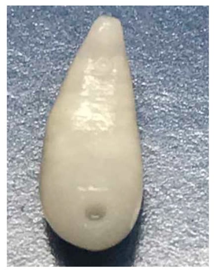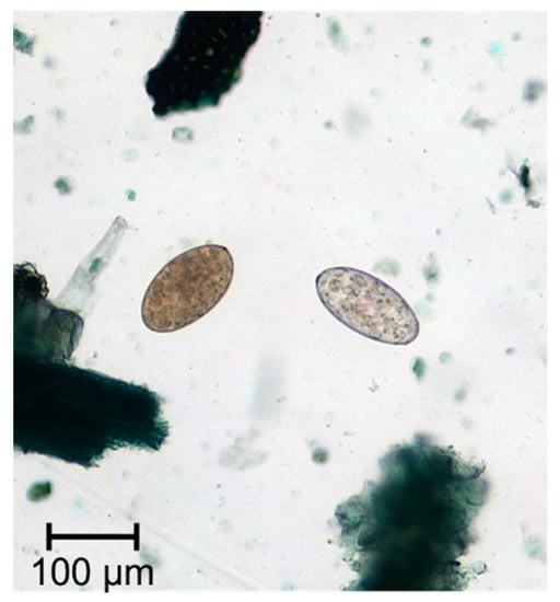 Dicrocoelium dendriticum (Figure 4) is 6–12 mm in length and 1.5–2.5 mm in width presenting in a lanceolate form with a smaller oral sucker and a larger ventral sucker, which are located in close proximity. The body of the fluke is semi-transparent, so that the internal organs are visible through the external surface. In contrast to Fasciola spp., D. dendriticum does not have external spikes on its tegument [10] (p. 85). The dark-brown, thick-shelled eggs are small, measuring 35–45 µm in length and 22–30 µm in width and the operculum is often inconspicuous [10] (p. 387).