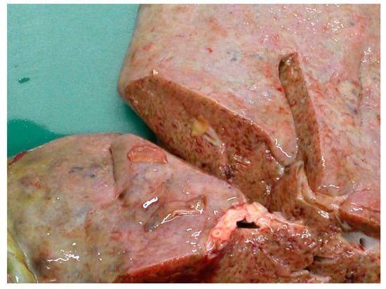 The migration through the liver parenchyma of the juvenile flukes causes considerable tissue damage followed by haemorrhage and fibrosis and immunological reactions [17]. According to a study by Rushton and Murray in Scotland in 1977 [18], the highest burden of immature flukes was found in the ventral lobe, where they induced a substantial system of haemorrhagic and necrotic tracks, which later formed conspicuous post-necrotic scars. Furthermore, penetrating flukes provoke portal and hepatic vein stenosis as well as pericellular fibrosis around the triads with hepatocytes either surrounded by collagen fibres or degenerated [18]. The damage is shown in Figure 3.