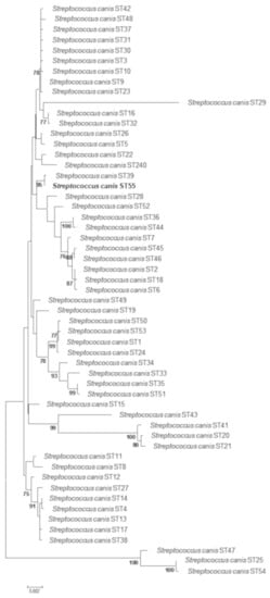 - Pinho, M.D.; Matos, S.C.; Pomba, C.; Lübke-Becker, A.; Wieler, L.H.; Melo-Cristino, J.; Ramirez, M. Multilocus Sequence Analysis of Streptococcus canis Confirms the Zoonotic Origin of Human Infections and Reveals Genetic Exchange with Streptococcus dysgalactiae subsp. Equisimilis. J. Clin. Microbiol. 2013, 51, 1099–1109. [Google Scholar] [CrossRef] [PubMed]