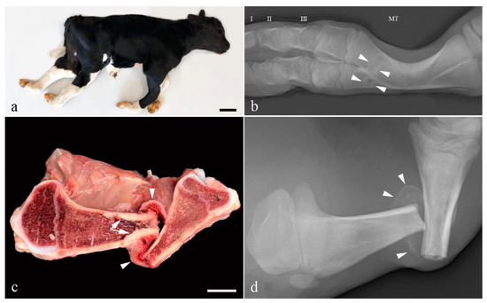 The limbs appeared shortened with bilateral symmetric flexion of the fetlock joint and mild lateral rotation of the digits. Flexion of the thoracic limb metacarpo-phalangeal joints was mild (15°) while it was almost 90° in the pelvic limbs. The tibiotarsal joints were extended (Figure 1a). Multiple long bones were abnormal and especially the metacarpal and metatarsal bones were bowed and appeared of reduced diameter (Figure 1b). Several transverse or oblique fractures, some with displaced fracture ends, were present in the long bones and the left hemimandible. Some fractures had fibrous callous formation and cortical bone proliferation. Non-aligned fracture ends showed abnormal healing (Figure 1c,d), while others were acute. Teeth appeared normal as did the color of the sclera.