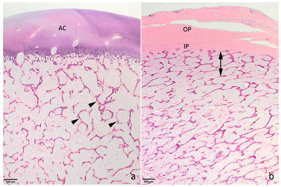 Photomicrographs showing the bone morphology of the OI affected Holstein calf. (a) The epiphyseal spongiosa is characterized by small trabeculae with remnants of chondroid matrix (arrow heads). The amount of spongious bone is reduced resulting in wide spaces between the trabeculae. AC: articular cartilage. Distal epiphysis, metacarpus. (b) The compacta (double headed arrow) is poorly developed and difficult to distinguish from the spongious bone. As for the epiphyses, the trabecular bone is poorly developed. IP and OP: inner and outer layer of the periost, respectively. Metaphysis, distal metatarsus. a,b: Haematoxylin and eosin.