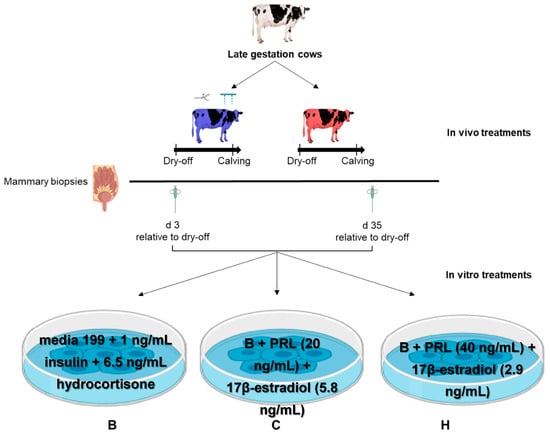 Schematic representation of the experimental design presented in the current study. Late gestation cows were dried off at 46 d before calving and assigned to 1 of 2 in vivo treatments: cooling (CL) (n = 7); provided shade of the barn and active cooling by soakers and fans (blue); heat treatment (HT) (n = 7); only provided shade of the barn (red). Mammary biopsies were collected at 3 d (to capture the involution phase) and 35 (to capture the mammary redevelopment phase) and tissue explants were incubated in 1 of 3 in vitro treatments: (1) Basal (B): no prolactin or oestrogen; (2) CL-mimic (C): B + 20 ng/mL prolactin + 5.8 ng/mL oestrogen or (3) HT-mimic (H): B + 40 ng/mL prolactin + 2.9 ng/mL oestrogen.