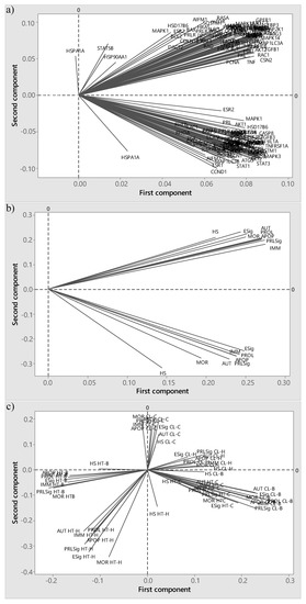 Loading plots describing relationships between: (a) mammary gland relative expression of 91 genes (as detailed in Table S1) and biopsy collection time point, (b) gene functions: heat shock (HS), prolactin signalling (PRLSig), oestrogen signalling (ESig), cell proliferation (PROL), autophagy (AUT), apoptosis (APOP), morphology (MOR), and immunity (IMM), and (c) in vivo and in vitro treatments from a principal component analysis. Figure 3c included genes averaged heat shock (HS), prolactin signalling (PRLSig), oestrogen signalling (ESig), cell proliferation (PROL), autophagy (AUT), apoptosis (APOP), morphology (MOR), and immunity (IMM), by in vivo and in vitro treatments CL-H, CL-C, CL-B, HT-H, HT-C, and HT-B.