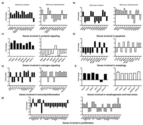 Gene expression in mammary gland tissue explants of heat-stressed dairy cows (HT) or cows provided active cooling (CL) during the dry period. Explants were collected during early involution (black columns, 3 d after dry off) and during mammary growth (white columns, 35 d after dry off) phases. Gene expression is reported as fold change (2-ΔΔCt) relative to cooled cows. An asterisk (*) indicates significant differences (p ≤ 0.05) and (#) indicates tendencies (0.05 < p ≤ 0.15) between HT and CL treatments. (a–g) refer to the gene function of interest.