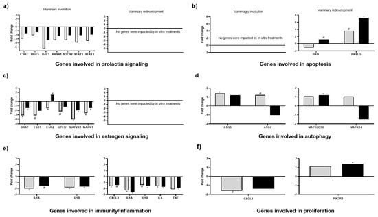 A significant interaction between in vivo and in vitro treatments was identified for 8 out of 91 targeted genes (Table 1). For example, during mammary involution, BRAF and ESR2, which are involved in E signalling, displayed a significant (both p = 0.03) interaction between the in vivo and in vitro treatments. During the redevelopment phase of the dry period, hydroxysteroid 17-beta dehydrogenase 6 (HSD17B6; E signalling), caspase 8 (CASP8; apoptosis), MAP1LC3B (autophagy), lipopolysaccharide binding protein (LBP; inflammation), vascular endothelial growth factor (VEGFA; morphology), and PIK3R2 (cell proliferation) displayed a significant interaction between the in vivo and in vitro treatments.