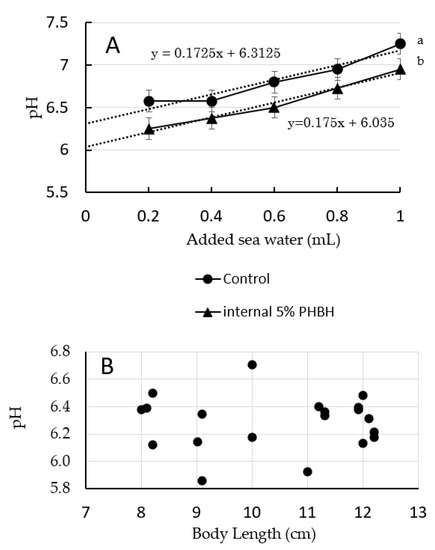 (A) Changes in pH of homogenized gut of Marsupenaeus japonicus versus the amount of seawater added to the homogenate. Shrimps were sacrificed after being reared for 6 weeks on standard diet (control) or experimental feed containing 5% (w/w) poly-hydroxybutyrate-co-hydroxyhexanoate (PHBH). Different superscript letters show significant differences (p < 0.05). The pH of the gut was estimated by extrapolating back to the y-axis of the best fit line. (B) pH values of the gut of M. japonicus individuals with different body lengths and reared on standard diet. pH values were obtained by the method shown in (A).