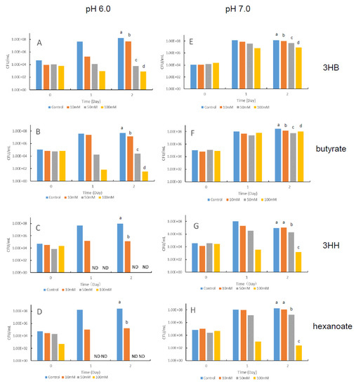 Growth of the shrimp-pathogenic bacterium Vibrio penaeicida in nutrient medium containing different concentrations of the hydroxyalkanoic acids 3-hydroxybutyrate (3HB) (A,E) or 3-hydroxyhexanoate (3HH) (C,G), or the fatty acids butyrate (B,F) or hexanoate (D,H) at pH 6.0 (left half) or 7.0 (right half). CFU: colony-forming units; ND: not detected. Different superscript letters in each figure show significant differences (p < 0.05).