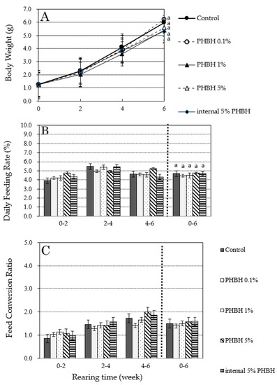 Increases in body weight (A) and changes in daily feeding rate (B) and feed conversion ratio (C) of Marsupenaeus japonicus during a 6-week feeding test with feed containing different amounts of poly-hydroxybutyrate-co-hydroxyhexanoate (PHBH). Different superscript letters show significant differences (p < 0.05).