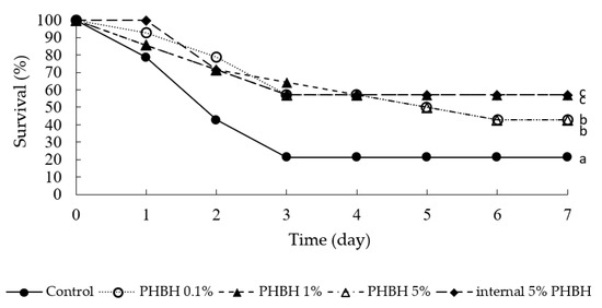 Survival rates of Marsupenaeus japonicus after infection with the shrimp-pathogenic bacterium Vibrio penaeicida. Nine weeks prior to bacterial infection and 1 week after infection, the shrimp were fed the feed containing different amounts of poly-hydroxybutyrate-co-hydroxyhexanoate (PHBH). Different superscript letters show significant differences (p < 0.05).