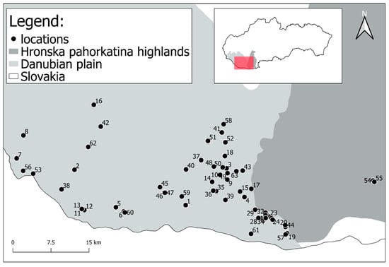 Voles were caught in snap traps until 2004 (from 1975), but since that year wooden traps (trap dimensions: 200 × 80 × 100 mm, length × width × height) have been used that do not kill them. Snap traps were checked once a day while live animal traps twice a day and left closed during the night. The traps were filled with bait—a mixture of cereals, apples, and mealworms. The line method was employed to catch voles and 50 capture points within ten metre distances one to each other were set up. The captured vole specimens came from 63 locations in south-western Slovakia and so the analysis also included animals that had been caught in snap traps or happened to have accidentally died in the live traps (Figure 1, Table S1).