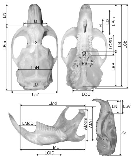 All skulls were cleaned with the aid of carnivorous beetles of the genus Dermestes. Paired features were always measured on the right side of the skull and jaw. The following cranial and jawbone features were monitored (according to Komosa et al. [29], Borowski et al. [25], Figure 2): LCr—total length of skull (Akrokranion—Prosthion), LCB—condylobasal length (condylus occipitalis), LB—total length of the cranial base (Basion—Prosthion), LBP—basal-palatal length (Basion—Staphylion), LPm—median palatal length (Staphylion—Prosthion), LFm—median frontal length (Akrokranion—Nasion), LuV—upper length of the viscerocranium (Nasion—Prosthion), LN—length of the nasals (Nasion—Rhinion), LaZ—zygomatic breadth (Zygion—Zygion), Ia—breadth across the supraorbital processes, Io—postorbital breadth (Frontostenion—Frontostenion), LOSD—length of the tooth row in the maxilla, LD—length of the diastema, LaN—neurocranium breadth (Euryon—Euryon), LM—length of the nuchal crest, LOC—breadth of occipital condyles, IS—breadth of incisive bone, PS—greatest palatal breadth, FI—length of foramen incisivum, LMd—total length of mandibula at processus articularis (longitudo mandibulae), AMd—coronoid height of mandibula (altitudo mandibulae), AMdm—maximum height of mandibula excluding coronoid process (coronoid process), LOID—length of mandibular tooth row (longitudo ordinis inferioris dentium), ML—mandible length excluding incisors, LMdD—length of mandibular diastema (Figure 1). All somatic and cranial features were measured with an electronic slide calliper to an accuracy of 0.1 mm. A 7× magnifying glass was used to obtain a detailed description of the dimensions.