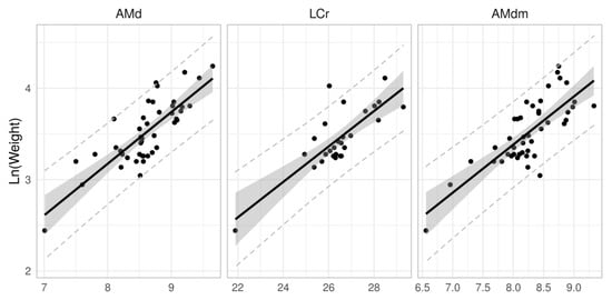 Balčiauskas and Balčiauskiené [27] opted to estimate the body weight of Microtus oeconomus stimmingi from 26 cranial and pelvic features. The correlation between 20 of the measured features and body weight was strong (r ≥ 0.6, p < 0.0001). Seven linear and multiple regressions estimated body weight with an error in the range of 5.5–15.0% from actual, measured body weight. Such a difference was not statistically significant in the study of Balčiauskas and Balčiauskiené.