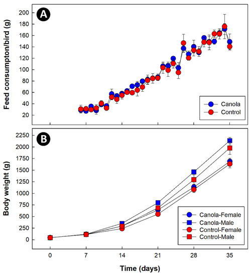 (A) Temporal feed consumption (g/bird/d) of broilers fed a diet supplemented with canola meal (20%) relative to a control diet. Feed consumption increased (p < 0.001) over time, but there was no difference (p = 0.514) between the diet treatments. (B) Temporal change in body weights (g) of female and male broilers fed a diet with canola meal (20%) relative to a control diet. Increases in the body weights of female and male birds differed over time (p < 0.001), and male birds were heavier (p ≤ 0.008) than female birds at day 21. There was no effect (p = 0.118) of the diet treatment on body weights.