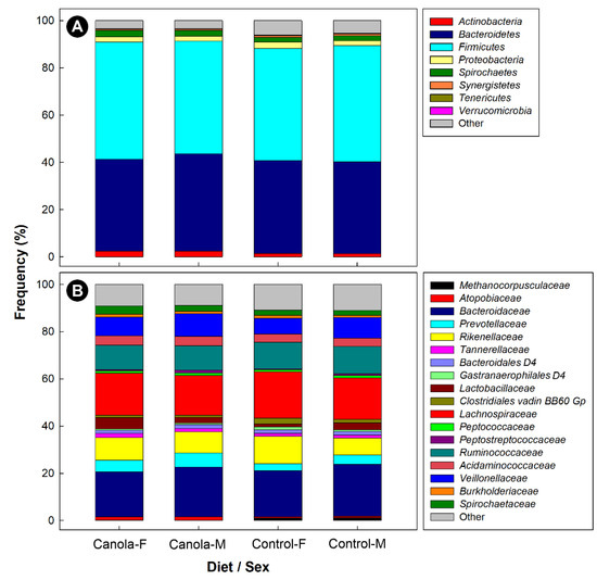 The relative abundance of archaea and bacterial phyla (A) and families (B) observed in the cecal digesta of 35-day-old female and male broilers fed a diet supplemented with canola meal (20%) or a control diet with ≥22,000 reads (n = 43). Data were averaged for female and male birds by diet treatment.
