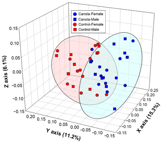 Principle coordinate analysis (unweighted UniFrac) of bacterial communities in the cecal digesta of female and male 35-day-old broilers fed a diet supplemented with canola meal (20%) or a control diet. Ellipsoids highlight the differences in community structure between communities in the digesta of birds fed the canola meal and control diets. The cecal communities differed between the two diets as determined by Jaccard (p = 0.001), Bray Curtis (p = 0.001), and unweighted (p = 0.001) and weighted (p = 0.016) UniFrac analyses.
