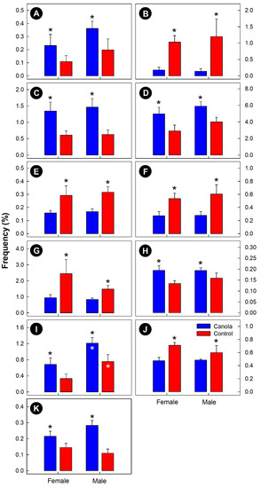 The relative abundance of select archaea and bacterial families (phylum-family names presented) in the cecal digesta of 35-day-old female and male broilers fed a diet supplemented with canola meal (20%) or a control diet. (A) Archaea-Methanobacteriaceae. (B) Archaea-Methanocorpusculaceae. (C) Actinobacteria-Atopobiaceae. (D) Bacteroidetes-Prevotellaceae. (E) Bacteroidetes-Bacteroidales D4 uncultured. (F) Firmicutes-Christensenellaceae. (G) Firmicutes-Clostridiales vadin BB60 group. (H) Firmicutes-Clostridiales D4 Family XIII. (I) Firmicutes-Peptostreptococcaceae. (J) Proteobacteria-Desulfovibrionaceae. (K) Proteobacteria-Succinivibrionaceae. The first name is the phylum and second name the family. Vertical lines that are associated with histogram bars are standard error of the means, and histogram bars indicated with a black asterisk indicate that abundances differed (p ≤ 0.047) between the two diet treatments. Bars marked with white asterisks indicate that abundances differed (p ≤ 0.050) between male and female broilers.