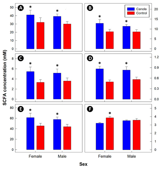 Short-chain fatty acid (SCFA) concentrations in the cecal digesta of 35-day-old broilers fed a diet supplemented with canola meal (20%) relative to a control diet as measured by gas chromatography. (A) Acetate. (B) Proprionate. (C) Butyrate. (D) Valerate. (E) Total SCFAs. (F) Ratio of two carbon to three carbon SCFAs. There was no difference (p ≥ 0.549) between females and males, and in both sexes higher (p ≤ 0.025) concentrations of SCFAs were observed in the cecal digesta of birds fed the diet with canola meal (indicated by asterisks).