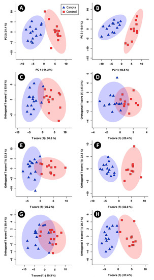 (A,B) Principle Component Analysis (PCA) showing unsupervised multivariate analysis of the cecal digesta metabolome among female (left) and male (right) from birds fed a diet supplemented with canola meal (20%) or a control diet. (C–H). Orthogonal Projections to Latent Structures Discriminant Analysis (OPLS-DA) showing supervised separation (p ≤ 0.014) for female (left) and male (right) birds fed the two diets. (C,D) Pancreas. (E,F) Liver. (G,H) Breast muscle. Each triangle or square represents one individual bird, and ellipsoids represent significant clustering by diet treatment at 95% confidence interval. For Figures A,B, the x-axis represents principle component 1, and the y-axis represents principle component 2. For Figures C–H, the x-axis represents the between-group variance (T-score), and the y-axis represents within-group variance (orthogonal T-score). Percent values in parenthesis show variances.