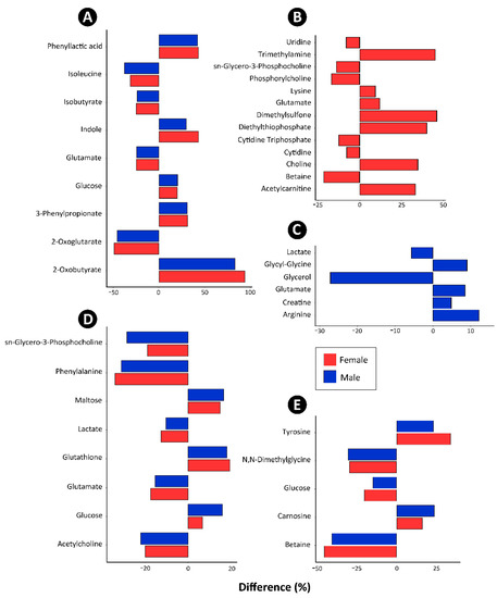 Average percent differences of individual metabolite quantities associated with female and male birds fed a diet supplemented with canola meal (20%) or a control diet as identified by a Mann-Whitney U test. All metabolites shown were significantly altered based on a p-value less than 0.05. (A) Cecal digesta. (B) Pancreas from female birds. (C) Pancreas from male birds (D) Liver. (E) Breast muscle. Negative values are less abundant, and positive values are more abundant in birds fed the canola meal diet.