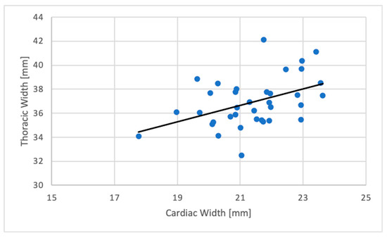 Scatterplot showing the relation between the cardiac width (mm) and the cranial coelom width (mm) in the VD radiographic projection (N = 36).