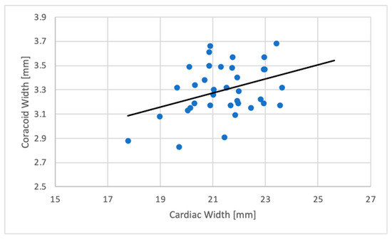 Scatterplot showing the relation between the cardiac silhouette width (mm) and the coracoid width (mm) in the VD radiographic projection (N = 36).