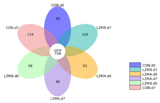 Venn diagrams were generated to compare OTUs between the different treatments of sow vaginal samples on the day of farrowing (d 0) and day 7 of lactation (d7). Venn diagram was generated to describe the common and unique OTUs among treatments at different day of lactation in sow vagina. CON. d0 = control diet at the day of farrowing, CON. d7 = control diet at day 7 of lactation, LZMA d0 = control diet + lysozyme 150 mg/kg at the day of farrowing, LZMA d7 = control diet + lysozyme 150 mg/kg at day 7 of lactation, LZMB d0 = control diet + lysozyme 300 mg/kg at the day of farrowing, LZMB d7 = control diet + lysozyme 300 mg/kg at day 7 of lactation.