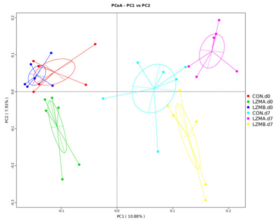 Comparison of the vaginal microbiota composition among treatments. Principal coordinate analysis to visualize the binary jaccard distances of vagina samples from individual sow. CON. d0 = control diet at the day of farrowing, CON. d7 = control diet at day 7 of lactation, LZMA d0 = control diet + lysozyme 150 mg/kg at the day of farrowing, LZMA d7 = control diet + lysozyme 150 mg/kg at day 7 of lactation, LZMB d0 = control diet + lysozyme 300 mg/kg at the day of farrowing, LZMB d7 = control diet + lysozyme 300 mg/kg at day 7 of lactation.