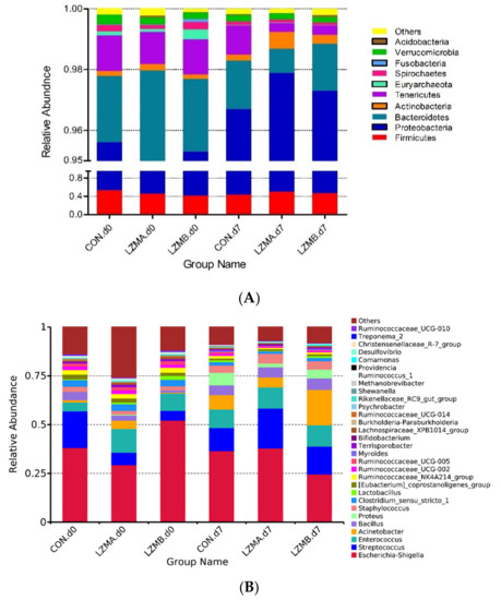 16S rRNA gene analysis reveals phyla (A) and genus (B) level differences in sow vagina between the treatments. CON. d0 = control diet at the day of farrowing, CON. d7 = control diet at day 7 of lactation, LZMA d0 = control diet + lysozyme 150 mg/kg at the day of farrowing, LZMA d7 = control diet + lysozyme 150 mg/kg at day 7 of lactation, LZMB d0 = control diet + lysozyme 300 mg/kg at the day of farrowing, LZMB d7 = control diet + lysozyme 300 mg/kg at day 7 of lactation.