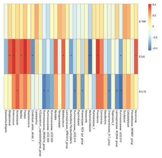 Heatmap of the spearman r correlations between the vaginal microbiota (genera level) significantly modified by metabolic parameters of sow. Data are presented as means ± SD (n = 6). * p < 0.05; ** p < 0.01 (following the Spearman correlation analysis). S.TNF = serum TNF-α, S.IL6 = serum IL-6, S.IL10 = serum IL-10.