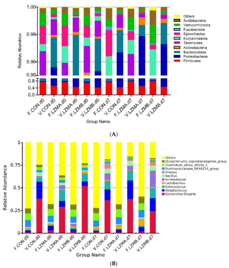 16S rRNA gene analysis reveals phyla (A) and genus (B) level differences between vaginal and rectum microbiota, and the treatments. F. = sample from fecal, V. = sample from vagina, CON.d0 = control diet at the day of farrowing, CON.d7 = control diet at day 7 of lactation, LZMA d0 = control diet + lysozyme 150 mg/kg at the day of farrowing, LZMA d7 = control diet + lysozyme 150 mg/kg at day 7 of lactation, LZMB d0 = control diet + lysozyme 300 mg/kg at the day of farrowing, LZMB d7 = control diet + lysozyme 300 mg/kg at day 7 of lactation.