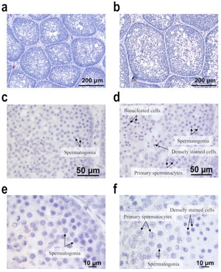 Effects of the nocturnal 1-h lighting on the histological characteristics of testes of our mule ducks. (a) Section from the testis of a mule duck in Group C displays thin seminiferous tubules. (b) Section from Group L+ reveals thick seminiferous tubules. (c,e) Section from Group C does not exhibit spermatogenesis, and only spermatogonia exist. (d,f) Section from Group L+ displays active spermatogenesis, and primary spermatocytes, as well as spermatogonia, are present. In addition, some small deeply stained cells and binucleated cells are present in the central area of the tubule in sections from Group B. No spermatozoa are observed in any sections. Group C was subjected to the natural photoperiod, and Group L+ was supplemented with 1-h artificial light from 20:00 to 21:00, in addition to the natural photoperiod. Hematoxylin and eosin stain.