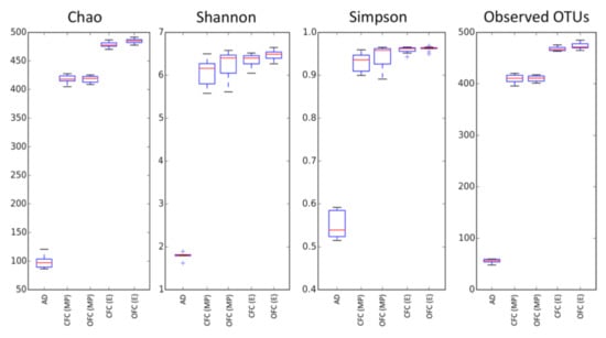Evaluation of alpha diversity in commercial and optimal farm conditions by using different calculation measures: Chao 1, Shannon, Simpson, Observed Operational Taxonomic Units (OUTs). AD: arrival day; CFC (MP): commercial farm conditions at mid-period; OFC (MP): optimal farm conditions at mid-period; CFC (E): commercial farm conditions at the end of the growing period; OFC (E): optimal farm conditions at the end of the growing period.