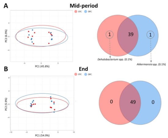Finally, at slaughter day (42 days of age), the most common genera were, likewise, U.m. of Firmicutes phylum (28.0% for both experimental groups), U.m. of Ruminococcaceae family (16.1% for CFC and 15.6% OFC), U.m. of Lachnospiraceae family (9.5% and 9.6%), and Oscillospira spp. (8.7% and 8.5%), followed by Bacteroides spp. (5.7% and 0.7% for CFC and OFC, respectively), Ruminococcus spp. (3.9% for both groups), and Coprococcus spp. (3.2% and 3.6%).