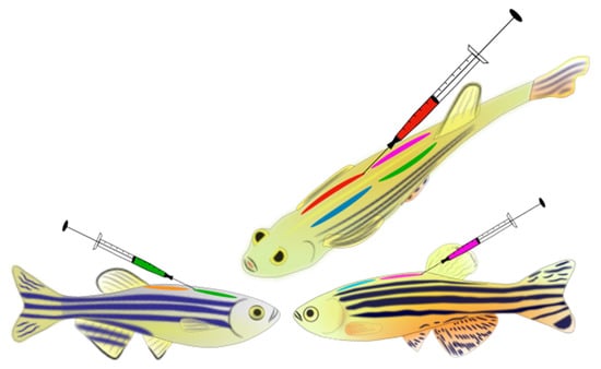 - Cheung, E.; Chatterjee, D.; Gerlai, R. Subcutaneous dye injection for marking and identification of individual adult zebrafish (Danio rerio) in behavioral studies. Behav. Res. Methods 2013, 46, 619–624. [Google Scholar] [CrossRef]